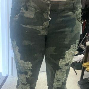 BALMAIN camouflage jeans with distressed detailing and gold mesh metal under distressed. Has stretch in good preowned condition size 8/10 moto