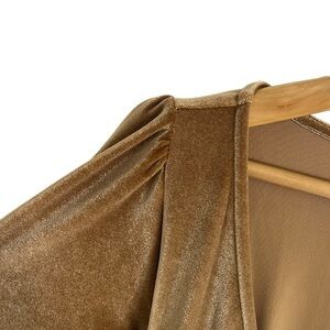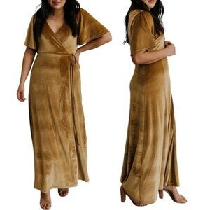 BALTIC BORN Meghan Gold Velvet Wrap Maxi Dress. Feel luxurious in an instant. Golden mid-weight velvet material, perfect for all seasons. Slight stretch throughout fabric. True wrap style with V-neckline and waist tie. Mid-length sleeves with a subtle bell shape. Long skirt with tulip hem. Bump and nursing friendly.