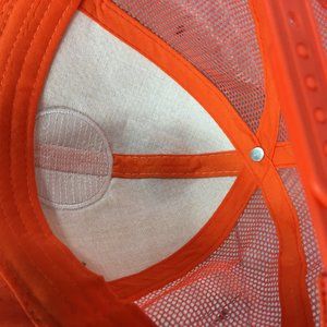 ORANGE WITH COOL "BASKET WEAVE" FRONT AND BRIM. GREAT STYLE FOR THE SUMMER! HAS EMBROIDERED PATCH ON THE FRONT OF HAT ALSO. ONE SIZE FITS ALL SNAP BACK