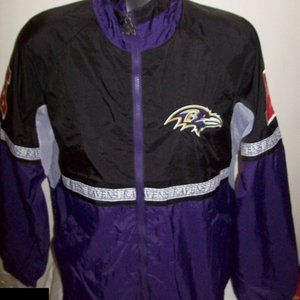 BALTIMORE RAVENS Official NFL STARTER Spring/Fall Nylon Jacket. NEW WITH TAGS. The Jacket is a Full Zip Jacket and it has a thick Nylon outter shell. The inside lining is smooth polyester. This is a very elaborate detailed jacket with the A for AFC with 4 Stars sewn on the sleeves. The jacket has 2 pockets on the outside "RAVENS" logo & Lettering is sewn on. Measurements of the jacket side to side under arms: M: 24" L: 25" XL: 26.5 2X: 27.5" This is a well built jacket. These are expensive on the buy side.