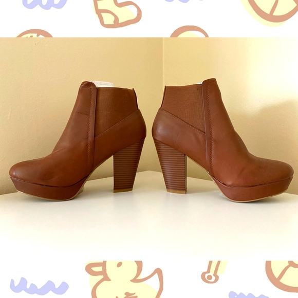 BAMBOO; size: 7.5; light brown short boots with slight color imperfections and minor scratches; great with jeans or dress; NEVER WORN