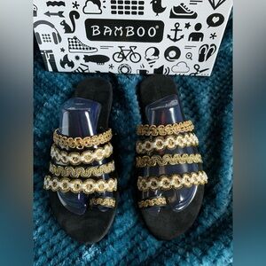 🌸BAMBOO Black & Gold Jeweled Strap Strappy Sandals in box.New! 4 sizes.