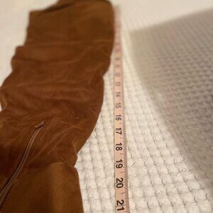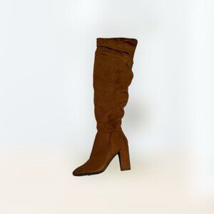 Excellent Condition BAMBOO over-the-knee boots in a rich brown hue are crafted from soft suede, offering a luxurious feel and a stylish slouchy silhouette. The chunky block heel provides both height and stability, making them a versatile choice for any occasion.