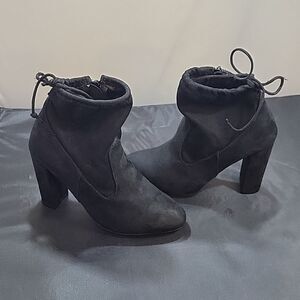 BAMBOO CHUNKY HEEL POINTED TOE WOMEN"S BOOTIE SIZE 7/37 COLOR BLACK Add a femme touch to your fall wardrobe with the Suede Booties! Soft faux suede shapes these cute sock boots that have an almond toe upper and a calf-high shaft with a cinching tie at the back. The chunky block heel makes these cute boots comfortable enough for all-day wear!3.5" wrapped block heel.Cushioned insole.Felted rubber sole has nonskid markings.Man made materials.THIS ITEMS IS PRE-OWNED EXCELLENT CONDITION WITH ONLY LIGHT SIGNS OF WEAR IF ANY CHECK THE PICTURES