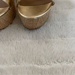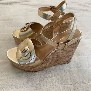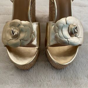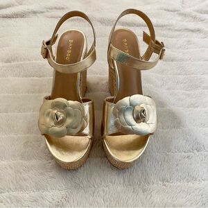BAMBOO Gold Flower Platform Wedge Sandals with Ankle Strap Size 10