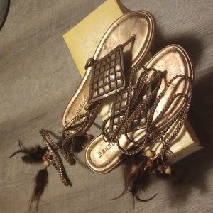 THIS IS A GORGEOUS PAIR OF BAMBOO LACE UP SANDALS IN A SIZE 6.5. THEY ARE A SHADE OF BRONZE WITH STRAPS THAT ARE BRAIDED AND HAVE BEADED ACCENTS AS WELL AS CHOCOLATE BROWN COLORED FEATHERS AT THE ENDS. JUST OVER EACH INSTEP IS A DIAMOND PATTERN WITH BEADED ACCENTS THROUGHOUT. THESE HAVE BEEN WORN MAYBE 2-3 TIMES IF THAT AND ARE STILL IN GREAT CONDITION. THEY ARE READY TO BE STYLED.