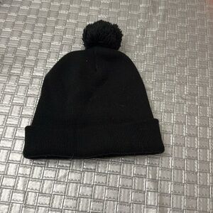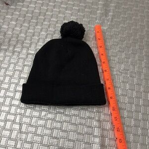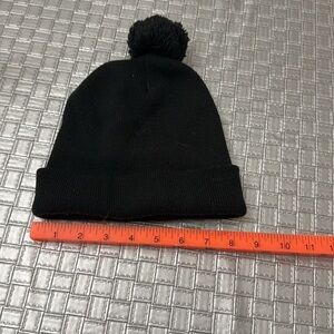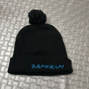 Black pom pom beanie, embroidered BAMFRAM hat, winter knit cuffed beanie, cozy black winter hat, unisex cold weather beanie, black beanie with blue embroidery, streetwear style knit hat, casual embroidered beanie, warm winter pom hat, trendy cuffed beanie, streetwear core, athleisure, cozycore, minimalist aesthetic, unisex style, functioncore.