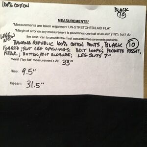 BLACK; 100% Cotton; FLAT FRONT, SLIGHTLY FLARED LEG, LOW to MID RISE; 2 (mock) front pockets, 2 (mock) rear pockets…sewn shut, unless you want to make pockets functional by ripping open their “mock pocket” seams; one button/zipper closure; unlined, belt loops; 7” slits on leg openings.