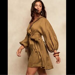 BANANA REPUBLIC 100% Linen Long Balloon Sleeve Mini Dress Tan Dry Mustard Size 4