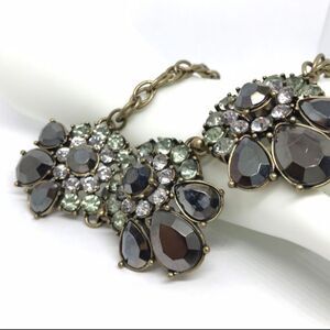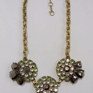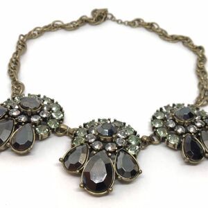 The Banana Republic antique gold-tone statement necklace exudes timeless elegance and sophistication. Featuring a classic 18"-20" adjustable chain, this piece boasts three dazzling floral-inspired pendants. Each pendant is meticulously crafted with a combination of sparkling green and grey faceted crystals, accented with shimmering clear stones. The intricate arrangement of teardrop and round-cut gems creates a luxurious and bold statement.