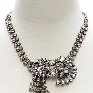 This exquisite Banana Republic antique silver-tone necklace is a true statement piece. The design features a harmonious blend of clear, champagne, and iridescent crystals arranged in a cascading cluster. The centerpiece showcases a dramatic array of teardrop, marquise, and round-cut stones, creating a visually stunning focal point. The necklace’s double-strand chain is crafted with intricate detail, perfectly complementing the shimmering crystals.