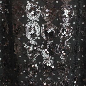 A mesh layer covered with circular patterns of sequins is layered atop a white polka dot-patterned knit tank top. New with tags.