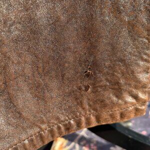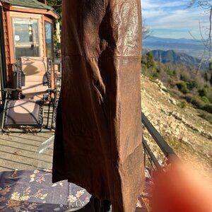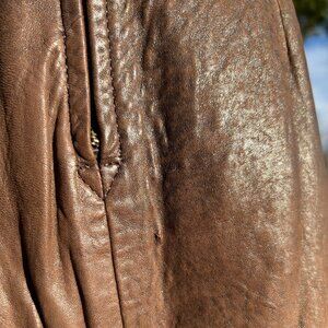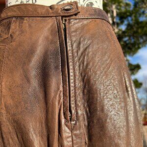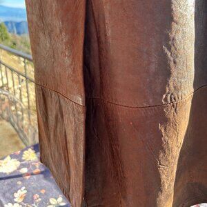 This wonderful, buttersoft pencil skirt is still not ready to be retired. Still has a lot of life in it. A few leather-related imperfections (ALL SEEMS ARE IN PERFECT SHAPE) gathered over the years (see photos) adds a bit of distressed character. Pair them with chunky boots, and all is well. And if you don't like it in its current design, the wonderful leather can be repurposed into a mini skirt, pillow cases, bags, etc.etc.