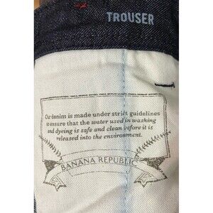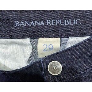 The product is a pair of Banana Republic dark blue denim straight leg trousers jeans in size 29. These mid-rise jeans feature a solid pattern, zip closure, and a cotton blend fabric wash. They are designed with slash pockets and have a regular fit with a 33-inch inseam. The stylish and versatile design of these jeans makes them a great addition to any woman's wardrobe, offering both comfort and a flattering silhouette.