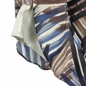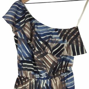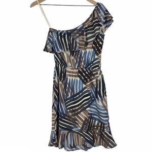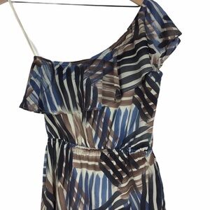 Banana Republic Factory Dress One Shoulder Ruffle Stripe Paint Swipe Abstract Size 0 Blue Brown Cream Off White Hatch Print
