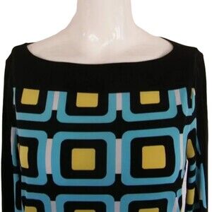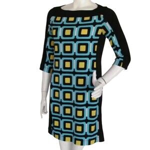 BANANA REPUBLIC Dress, S, Op-Art, 3/4 sleeve, Wide neck, Black, Blue, Yellow