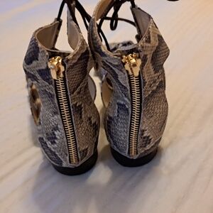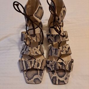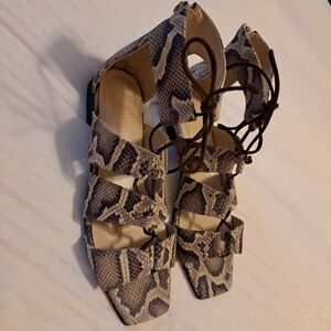 The Banana Republic Medina Flat Leather Sandals in size 8 are a stylish and versatile addition to any woman's shoe collection. Featuring an open toe design and lace-up closure, these sandals are perfect for casual occasions during the summer, fall, and spring seasons. Made with high-quality leather, the sandals also boast adjustable straps for a comfortable fit. The animal print pattern in python color adds a trendy touch to the overall look, making these sandals a fashionable choice for any woman looking for a chic and comfortable footwear option.