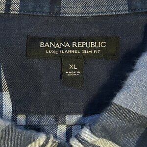 The product is a Banana Republic men's blue plaid luxe flannel slim-fit button-up shirt in size XL. This shirt features a slim fit design, long sleeves, and is made of flannel fabric. It is intended for a casual yet stylish look, as it combines the comfort of flannel with the sleekness of a button-up shirt. The blue plaid pattern adds a classic touch to the overall design, making it a versatile piece for any man's wardrobe.