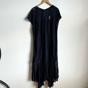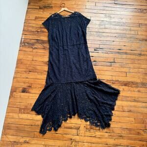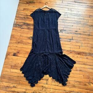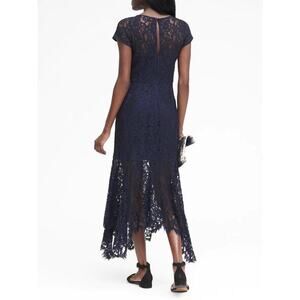 Details: Navy blue lace trumpet midi dress from Banana Republic. Features a handkerchief hem, boatneck, and invisible back zipper. Lined in the bodice and extends from the waist to the knee. Short sleeves and an intricate lace pattern throughout. It is a trumpet-style dress, fitted through the body and flaring out at the hem. This would be a great dress for a wedding guest, date night, or other occasion!