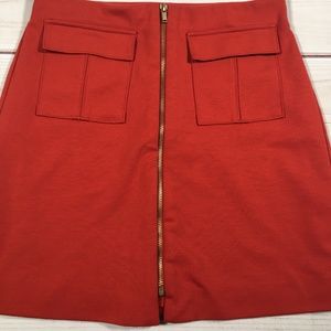 Pictured is a Banana Republic orange front zip mini skirt in size 2. Gently used, please see photos for garment quality and condition.