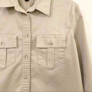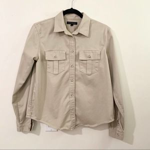 This is a gently used women's Banana Republic straight fit Quinn Utility Jacket in a neutral tan khaki color.