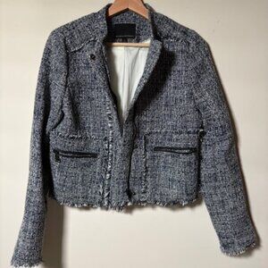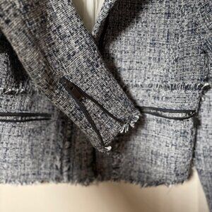 Banana Republic Raw Hem Tweed Moto Jacket in Blue, (royal blue, black and white threat). Zip and snap in the front. Two zip front pockets, Zip cuffs, Nehru collar. Fabric is medium to thick weight. 94% Polyester, 6% Spandex/Elastane. Fully lined. Dry clean only. Perfect jacket for Spring or Fall.