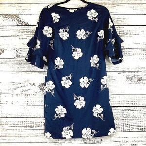 Banana Republic Brand, Size 0 , navy blue color with white flowers, short ruffles sleeves, mini dress, zipper on the back, round neckline, excellent pre owned condition, super cute .