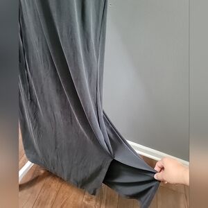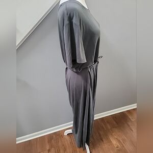 The BANANA REPUBLIC Sandwash Maxi T-Shirt Dress in XL is a stylish and versatile option for women looking for a comfortable yet fashionable outfit. Made from a modal blend fabric, this dress features a mock neck, short sleeves, and side slits for added convenience. The long length and solid black color make it perfect for casual occasions or traveling during the summer, fall, or spring seasons. With its lightweight design and pleated accents, this dress is a great addition to any wardrobe for a chic and casual look. This has a tiny pinhole on the right side near the slit that is barely visible. Otherwise it's in excellent preloved condition.