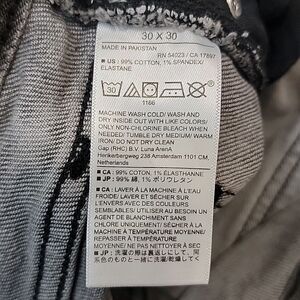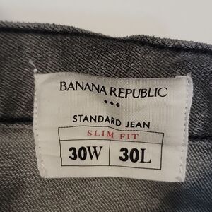 Pre-owned Banana Republic slim fit standard jean size 30x30. Classic style with zip and button front closure. The color is a grey-black wash. Area by knee has a darker area do to the wash. Please see photos.
