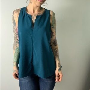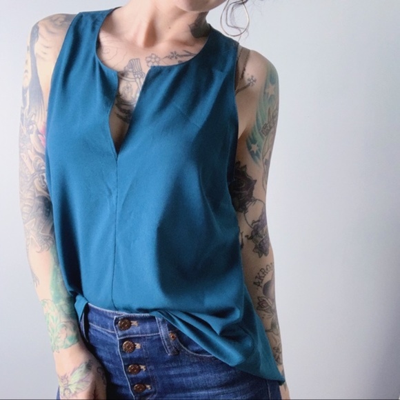 Features: Sleeveless, slight flared hem in back, split v neck, blousey material