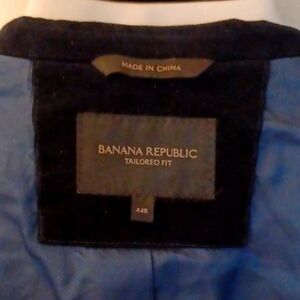 This amazing #BananaRepublic 'tailored fit" blazer / sportcoat is a timeless classic. 44 Regular. Dark blue corduroy that resembles velvet. Cotton-spandex outer shell with acetate lining. Features two-button, front closure; three front pockets; four-button sleeves; and a single vent back. The inside back collar features an aristocractic-style, burgundy, print-patterned felt fabric, as pictured. In great, gently-used condition. Best offers welcomed.