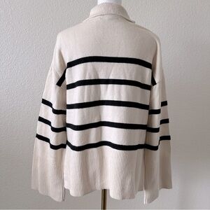 Striped sweater with a loose silhouette and drop shoulders accented with a slit hem, long sleeves, turtleneck, ribbed sleeves and ribbed hem border.