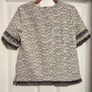 A cute all season top in a black and white nubby like fabric, with small fringe detailing. It has a high scoop neck and a half zipper in the back.Only worn a few times. From a smoke and pet free home.