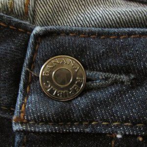 BANANA REPUBLIC WOMEN'S SIZE 4 S JEANS DARK BLUE DENIM MID RISE BOOT CUT. Fabric: 98% Cotton, 2% Spandex. Zip front fly with intact and working metal zipper. Pewter colored riveted button on waistband says "BANANA REPUBLIC*" around the circumference. Pewter colored rivets on front pockets say "BANANA REPUBLIC" around the circumference. Traditional 5 pocket jeans with slightly stretchy waistband. Coin pocket has a flap with a pewter colored riveted button. Back pockets have flaps with riveted button closures and rivets at top corners. Belt loops. Yoke in back. Traditional gold top stitching.