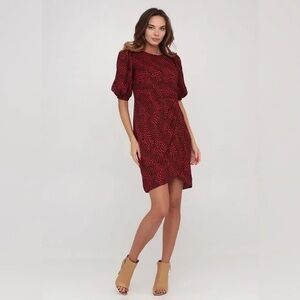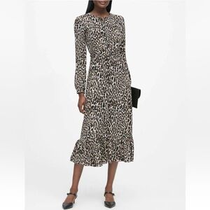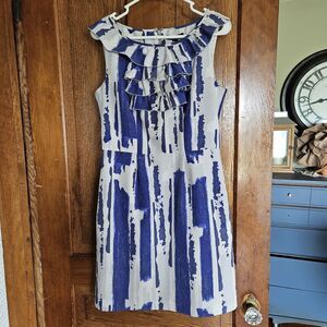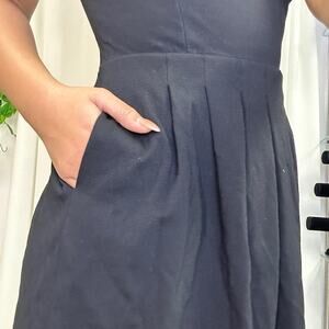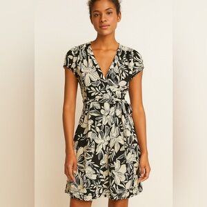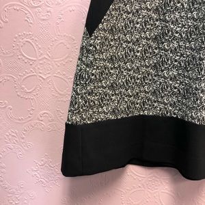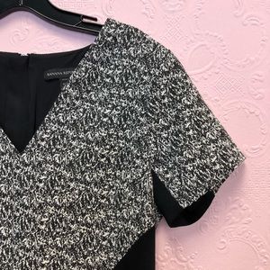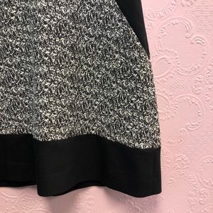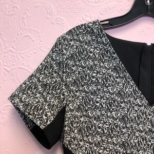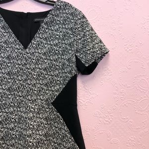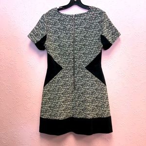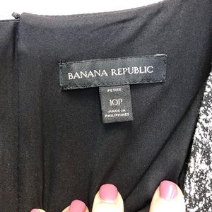 EUC BANANA REPUBLIC shortsleeved black and gray dress with geometric cut-ins at waist for flattering look. This dress POPS! Fully lined with visible zip up the back. Hand wash cold; line dry. Premium cloth with v-neck. RN 54023 Shell: 56% cotton 44% polyester. Lining: 100% polyester. Approximate Measurements (laying flat): waist 15” bust 18.5” length: 33.5” pit to cuff: 2.5” flare: 24.5”