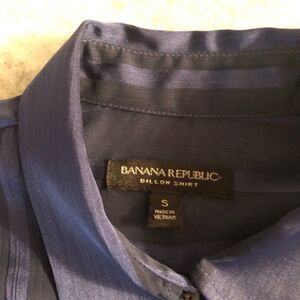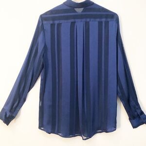 Banana Republic Blouse. Blue / black stripe. Sheer. Long sleeve, button down. Ruffle front detail. 100% Polyester. Womens size: S