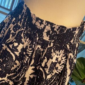 Such a cute skirt with wide elastic waist band and a Navy Blue and White Batik Print. 100% cotton, lined.