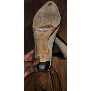 fabric and brown leather almond toe heels with buckled accents pump. Heel aprx 4”