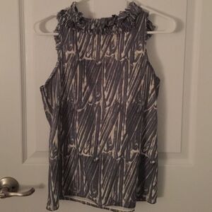 Fun collar and classy design. Looks great tucked in or out, with pants or skirts. Versatile for weekender top, or work attire.