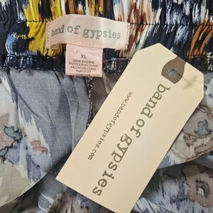 New with tag! Band of Gypsies Women's Wide Leg Flowy Pants. Size XL. Blue, white and yellow floral pattern. High rise. Hand pockets. Back elastic waist. Missing material tag. Feels and looks like rayon.