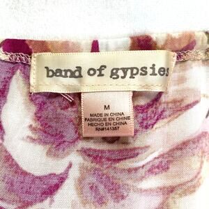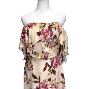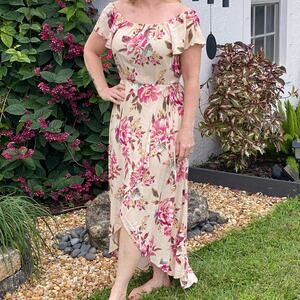 BAND OF GYPSIES Maxi Dress Sz M Floral Faux Wrap Beige Pink Flutter Sleeve Boho