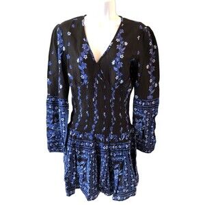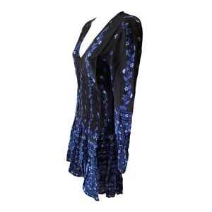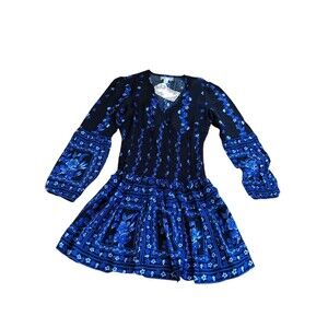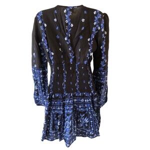 This beautiful Band of Gypsies dress is perfect for any occasion. The black and blue floral pattern is eye-catching and the A-line style is flattering on any body type. The dress has a smocked waist and a midi length, making it both comfortable and stylish. The pullover closure and see-through sleeves add to the dress's delicate look. The dress is a women's size small and is perfect for regular sized women.