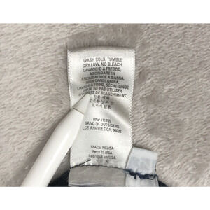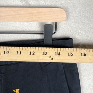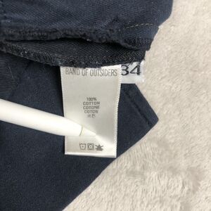 These navy blue chino pants by BAND OF OUTSIDERS feature pixel embroidered accents and a button fly closure. Made of 100% cotton with a flat front design, they have a size 34 waist (actual 30") and a 27-inch inseam . The pants are machine washable and have a casual style suitable for everyday wear.