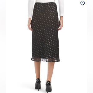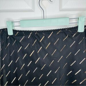 BAND OF GYPSIES Gold Metallic Flocked Overlay Midi Slip Skirt Black M NWT. Small lace lines elastic waist. Stretchy waist. Gold lines flock the overlay with black lining underneath. Longer midi length. Can be dressed up or down. New With tags.