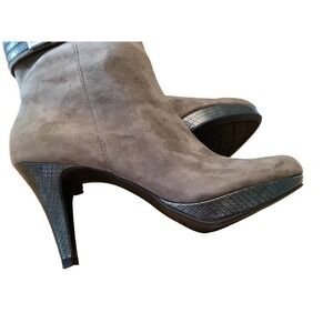 BANDOLINO “Calluna” women’s suede side zip booties. Size 7.5M. New Without Box. The color is kind of a dark taupe/olive. Full side zipper. Decorative side turn lock. Heel and platform are reptile embossed. Rubber sole. Padded footbed.