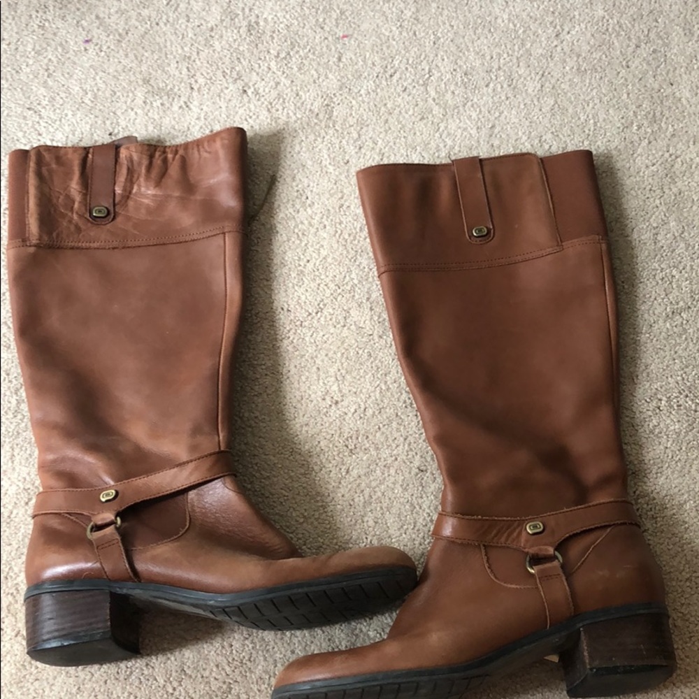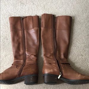 worn riding boots, some damage on them that can be seen from photos but no holes or tears in the leather, i’m 5’9 and these come up about mid way on my calf