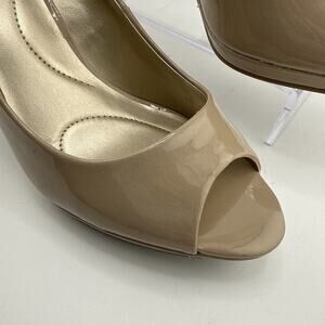 BANDOLINO Supermodel Platform Peep Toe Vegan Patent Pumps Beige Size 9 M NWB