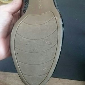 Shiny black and super cute! Right shoe has small nick on heel as pictured. Worn only once, barely. They were a little big for me. I will ship in the original box.