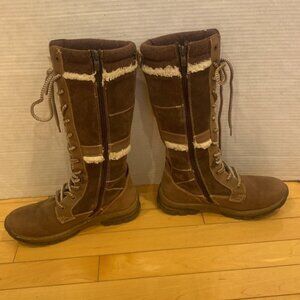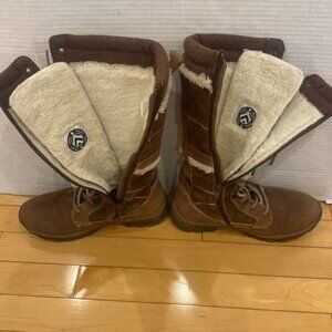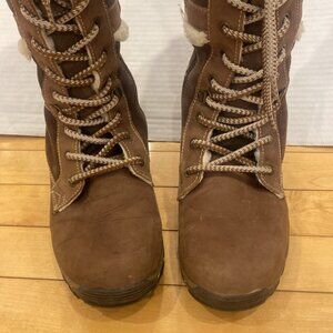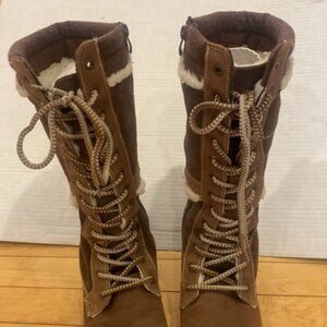Brand: Banff Trail, (made in China not Banff) Women’s mid-calf, warm water resistant Winter boots with warm faux fur lining, brown suede-like material and lace-up front closure and side nylon zipper closure. Sole of boots are of quality with good grip. Tip of bits have. Boots are like new. Size 7