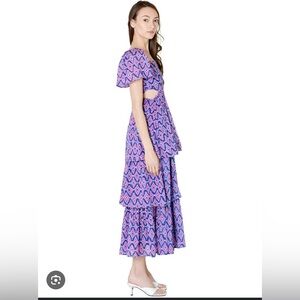Impactful and modern, the Bonnie dress pairs a sleek side cut out with a soft flutter sleeve and dance floor ready full tiered skirt.